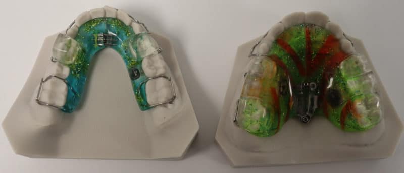 Chaque plaque a des blocs correspondants, qui encouragent la mâchoire inférieure à avancer lorsque les dents se rejoignent. Une vis d’expansion peut également être incorporée dans la plaque supérieure pour élargir la mâchoire supérieure ou des tubes afin d’accrocher un casque extraoral.